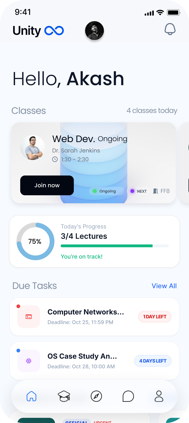 Unity is a campus super-app that connects students, learning resources, opportunities, and services — all in one place, built for modern university life.